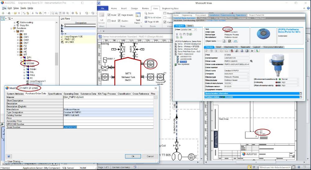 Aucotec sorgt für die Verlinkung von EB mit dem Portal. Aufgrund der Dreischicht-Architektur der kooperativen Engineering-Plattform war die Kopplung „so einfach und schnell lösbar wie mit keinem anderen System“, wie Prozess-Manager Andreas Schiefelbein von Endress+Hauser berichtet. Die Anbindung an Webservices funktioniere in EB quasi mit ‚Bordmitteln‘, es seien keine individuellen .Net/VBA-Programmierungen nötig, erklärt Norbert Ott, Produktmanager bei Aucotec. Der jeweilige Anwender muss nur die Referenz zwischen der Seriennummer und seinem Anlagen-Asset pflegen, „mehr Aufwand ist es nicht!“, so Schiefelbein.