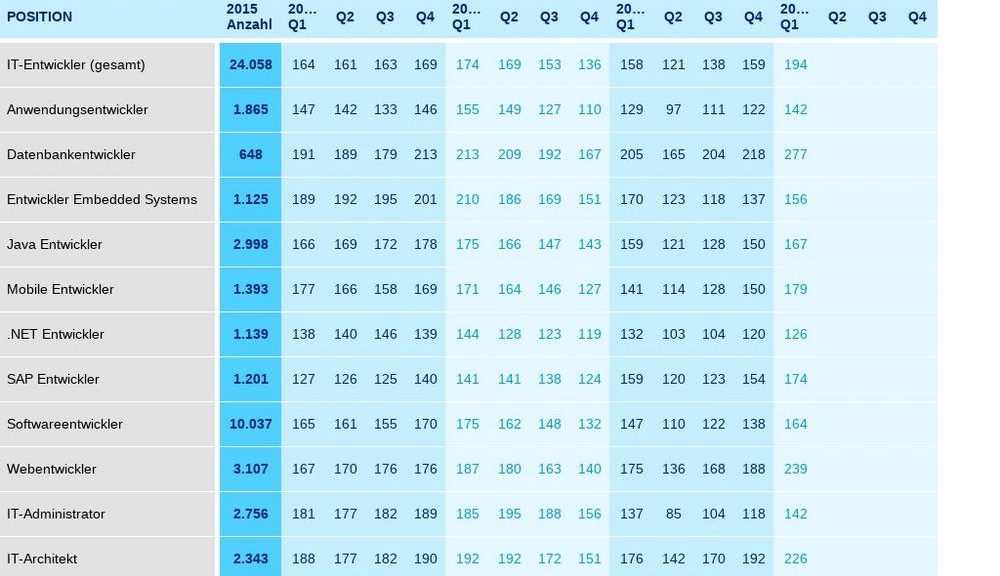 Gegenüber dem Vorjahresquartal stiegen die Index-Werte der meisten untersuchten Positionen ebenfalls im 1. Quartal 2021. Besonders stark geschah dies bei IT-Security-Spezialisten (+110 Punkte), Datenbankentwicklern (+72 Punkte) und Web-Entwicklern (+64 Punkte). Gegen den allgemeinen Trend sanken die Index-Werte für die Entwickler von Embedded-Systemen (–14 Punkte auf 156) und .NET-Entwicklern (–6 Punkte auf 126).