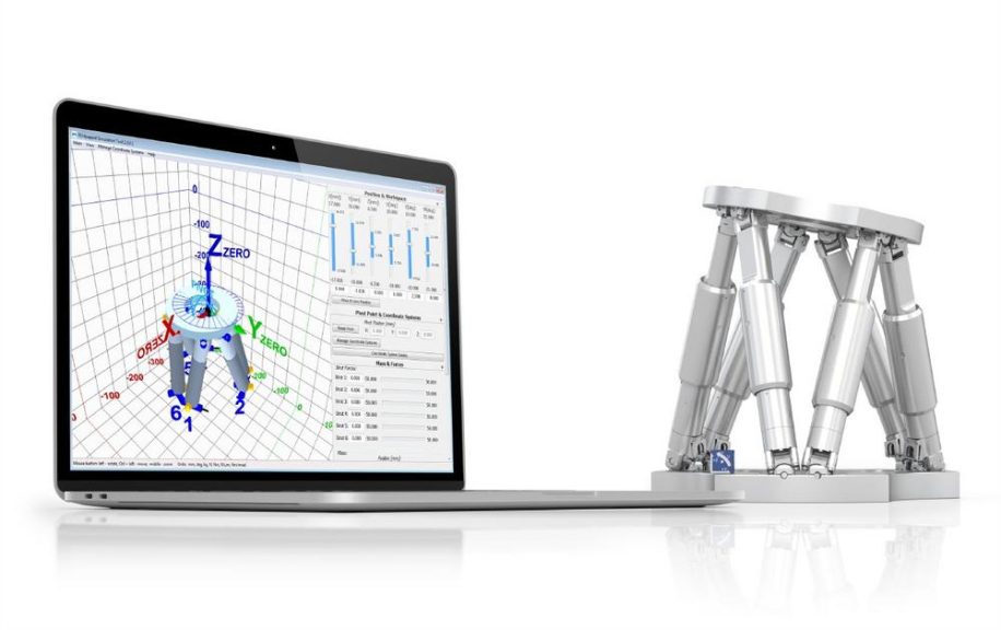 Gleiches gilt für den Belastungsgrenzwert des Hexapods, der ebenfalls in Abhängigkeit von verschiedenen Faktoren variiert. Dazu zählen die Einbaulage des Hexapods, die geplante Last und vor allem auch die Position des Masseschwerpunkts, die jeweilige Position der Bewegungsplattform (Translations- und Rotationskoordinaten) sowie die Kräfte und Momente, die an der Bewegungsplattform des Hexapods und an den einzelnen Beinen angreifen. Auch diese Einflussfaktoren lassen sich mit grafischer Unterstützung, z.B. per Schieberegler, simulieren, um Klarheit zu schaffen, welche Hexapoden-Ausführung sich eignen könnte. Dadurch vereinfacht sich der Einstieg in parallelkinematische Positionierlösungen deutlich.