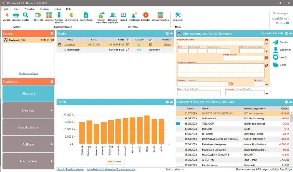 Diese Software ist von Anfang an sehr leicht und intuitiv bedienbar. Mit allen ALF-BanCo Versionen haben Sie stets den perfekten Überblick über Ihre Finanzen: Einnahmen und Ausgaben auf einen Blick, Überweisungen per Mausklick und über die Auswertungen entdecken Sie vielleicht noch Einsparpotential?