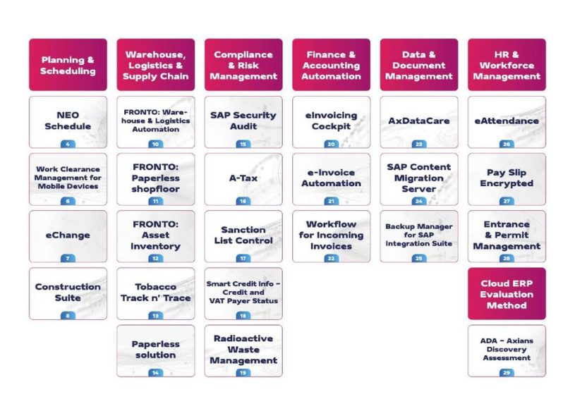 Das Axians SAP Add-on-Portfolio mit 24 eigenen Anwendungen ergänzt die SAP-basierten Lösungen für spezifische und kritische Anwendungsbereiche – von der automatisierten Sanktionskontrolle über das Management radioaktiver Abfälle bis hin zu datenbasierten Prozess- und Compliance-Lösungen für die Verteidigungsindustrie. Die Lösungen, die Axians in fünf verschiedenen Ländern entwickelt hat, decken unterschiedliche Geschäftsprozesse ab: von Planning & Scheduling über Warehouse, Logistics & Supply Chain, Compliance & Risk Management, Finance & Accounting Automation, Data & Document Management bis hin zu HR & Workforce Management.