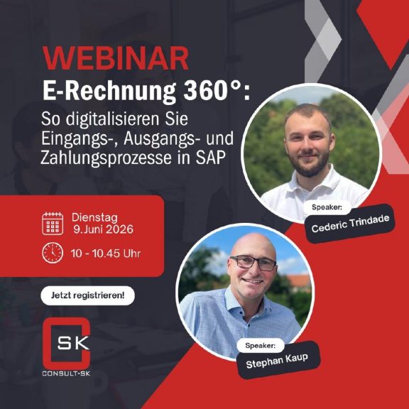 Mit dem Webcast „E-Rechnung 360°: So digitalisieren Sie Eingangs-, Ausgangs- und Zahlungsprozesse in SAP“lädt die Consult-SK GmbH am 9. Juni 2026 von 10:00 bis 10:45 Uhr zu einem kompakten Praxisformat rund um die digitale Abbildung von Rechnungs- und Zahlungsprozessen im SAP-Umfeld ein.