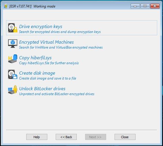 Das Tool hilft beim Zugriff auf verschlüsselte Datenträgercontainer. Dies kann durch das Extrahieren von Passwort-Hashes für weitere Brute-Force-Angriffe erreicht werden, und durch eine Speicheranalyse bei der Suche nach Verschlüsselungs-Schlüssel. Zur Beweissammlung können Container entschlüsselt oder gemountet werden.