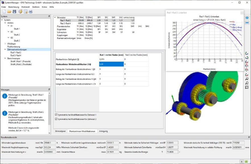 In der neuesten Version wurde die Tragfähigkeitsberechnung nach DIN 3990 und ISO 6336 in den Berechnungsmodulen für Stirnradpaare, Planetenstufen, 3er- und 4er-Räderkette sowie Zahnstangen überarbeitet und erweitert. Es ist nun möglich, weitere Faktoren, wie Rauheits-, Schmierstoff-, Geschwindigkeits- oder Größenfaktor individuell vorzugeben. Weiterhin wurde die Berechnung im Zeitfestigkeitsbereich verbessert.